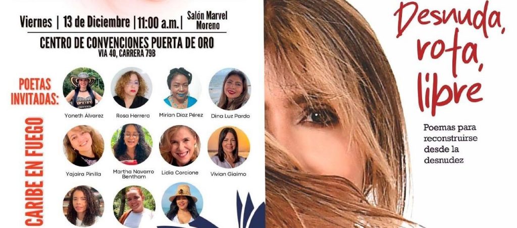 El 13 del presente diciembre, un día muy especial, en la Feria Internacional del Libro de Barranquilla, una pléyade de poetisas dio un recital, denominado “Caribe en fuego“, en la sala Marvel Moreno del Centro de Convenciones Puerta de Oro. Entre las poetas invitadas estaban: Yaneth Alvarez, Rosa Herrera, Mirian Díaz, Dina Pardo, Vivían Giaimo, Lidia Corcione, Martha Navarro y Yojaira Pinilla. El recital se tituló: “desnuda/rota/libre. Poemas para reconstruirse desde la desnudez”.